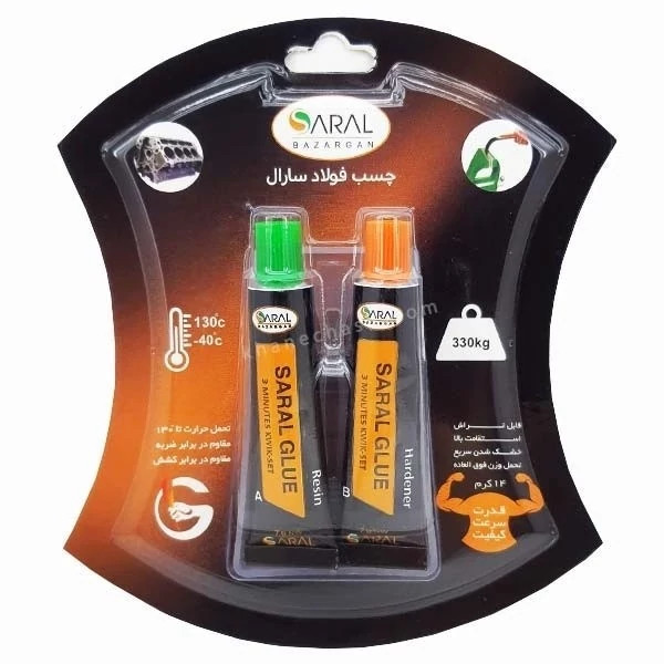چسب دوجزئی فولاد سارال دوقلو در عرض 2 دقیقه خشک شده همچون آهن قابل تراش می شود. چسب دوجزئی فولاد سارال دوقلو یکی از با کیفیت ترین چسب ها در رده خود میباشد که به صورت دو جزئی به بازار عرضه میگردد برای همین به آن چسب دوقلو میگویند . این چسب در کشور آلمان به تولید رسیده و توسط شرکت سارال در ایران بسته بندی شده است . یکی از ویژگی های منحصر به فرد چسب دوجزئی فولاد سارال دوقلو سرعت خشک شدن بالای آن میباشد که از هدر رفت زمان جلوگیری میکند . سرعت خشک شدن چسب دوجزئی فولاد سارال دوقلو بگونه ای است که تنها پس از گذشت 2 دقیقه خشک میشود و قطعات مورد نظر را بخوبی به یکدیگر میچسباند. اگر نیاز به چسب مات کدر یا خاکستری رنگ دارید چسب غفاری را به شما پیشنهاد میکنیم که میتوانید از این لینک خریداری نمایید. اگر برای چسباندن قطعات خودرو به چسب نیاز دارید چسب دوقلوی ایم سیل را به شما پیشنهاد میکنیم که میتوانید از این لینک خریداری نمایید. ویژگی قابلیت تراش خوری و سنباده خوری با تحمل حرارتی 130 درجه و شوک حرارتی 210 درجه سانتی گراد. در مورد چسباندن لوله ها، بهتر است بعد از 24 ساعت از مصرف چسب ، لوله تحت فشار قرار گیرد یا فلکه آب باز شود. در صورتی که عجله دارید، میتوانید محل مورد نظر را تا 70 درجه سانتیگراد، به مدت 20 دقیقه حرارت دهید. (مثلاَ با سشوار) چسب دوقلوی فولاد سارال میتواند هر نوع فلز را با تحمل باور نکردنی 60 کیلوگرم بر سانتیمتر مربع به صور دائمی بچسباند. چسب دوقلوی فولاد سارال میتواند دو قطعه تسمه آهنی را طوری بچسباند که آهن خم شود ولی محل چسبیده، جدا نشود. کاربرد چسب دوجزئی فولاد سارال دوقلو مناسب جهت چسباندن فلزات ، اکثر پلاستیک ها ،سنگ چوب ،چینی ،سیلندر ،کارتل روغن اتومبیل ،رادیاتور ،باک بنزین ،لوله آب فلزی ،آبگرمکن ،مبل ،تانکرهای حاوی آب ،اسید ،حلال و مواد شیمیایی با تحمل حرارتی 130 درجه سانتی گراد. فلزات ، پلاستیک ، ABS ، PVC ، سنگ ، چوب ، سرامیک ، چینی و… با تحمل حرارتی 130 درجه سانتیگراد مناسب جهت ترمیم و چسباندن سیلندر و کارتل روغن اتومبیل ، لوله ، رادیاتور ، شوفاژ ، باک بنزین ، مبل ، آینه بغل و داخل اتومبیل ، تانکرهای فلزی و پلاستیکی حاوی آب ، اسید ، حلال و مواد شیمیایی برای چسباندن اجسام مختلف، پلاستیک ها و لاستیک ها، سنگ، گرانیت، سرامیک و سرامیک صنعتی، چینی، پلی استر و … با تحمل حرارتی 130 درجه سانتی گراد مناسب جهت ترمیم و چسباندن سیلندر و کارتل روغن اتومبیل، رادیاتور، لوله فلزی، آبگرمکن، شوفاژ، باک بنزین، آینه بغل و داخل اتومبیل، تانکرهای حاوی آب، اسید، حلال و مواد شیمیایی. چسب دوجزئی فولاد سارال بسیار مناسب است نحوه مصرف 1-آماده سازی محل : ابتدا محل مورد نظ را كاملا خشک و اگر بر روی سطح رنگ است با سنباده داخل جعبه تمیز نمایید. در صورتیكه می خواهید عملیات چسباندن ایده آل شود توسط استون صنعتی محل را تمیز كنید استفاده از بنزین توصیه نمی شود زیرا دارای درصد كمی روغن می باشد. با توجه به اینكه سرعت خشك شدن چسب و شروع واكنش بسیار سریع است قطعات مورد نیاز خود را اول آماده كنید و محل اتصال را مشخص كنید تا از اتلاف وقت خودداری شود. 2-دو جزء را به نسبت مساوی مخلوط کرده و سریعا از آن استفاده نمایید. 3- زمان لازم تا كاربری : بعد از اینكه چسب مخلوط شد قبل از اینكه گرم شود بلافاصله به محل بمالید و از تكان دادن محل در حال چسبیدن خودداری كنید و به مدت 5 دقیقه با دست ثابت نگه دارید بعد از 5 دقیقه می توانید دست خود را بكشید ولی از فشار دادن قطعه اجتناب كنید زیرا زمان خشك شدن نهایی و كامل شدن پیوند مولكولی چسب 3 الی 20 ساعت می باشد